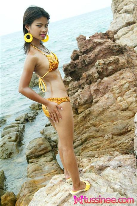 Tussinee: 18 year old Thai teen in tiger bikini at the beach
