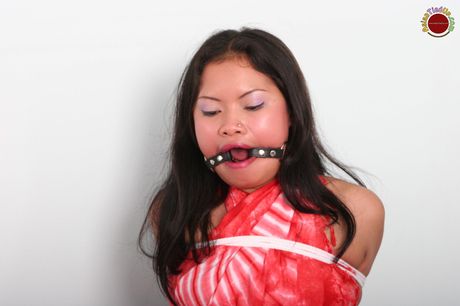 Asian Tied Up: Asian girl with tiny tits strips and unveils her pussy up close