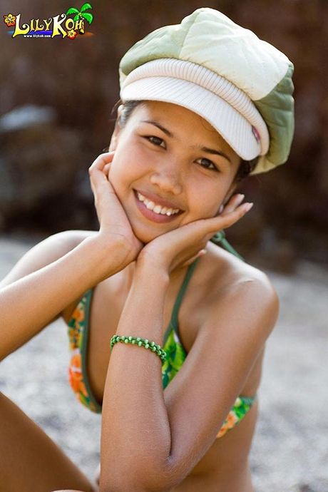 Lily Koh: Bikini Asian teen in hat flashes small boobies