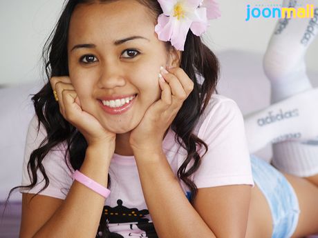 Joon Mali: Shy Asian teen in pink t-shirt shows little blue panties