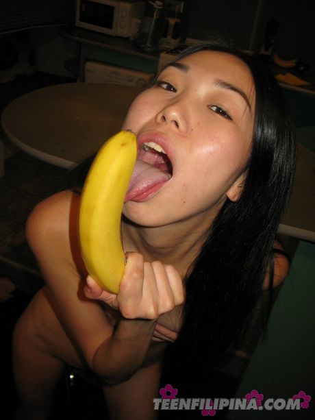 Teenfilipina.net: Skinny Asian girlfriend toying her pussy with a dildo in the kitchen
