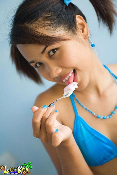 Lily Koh: Slender Asian Lily Koh pours milkshake on her teen body